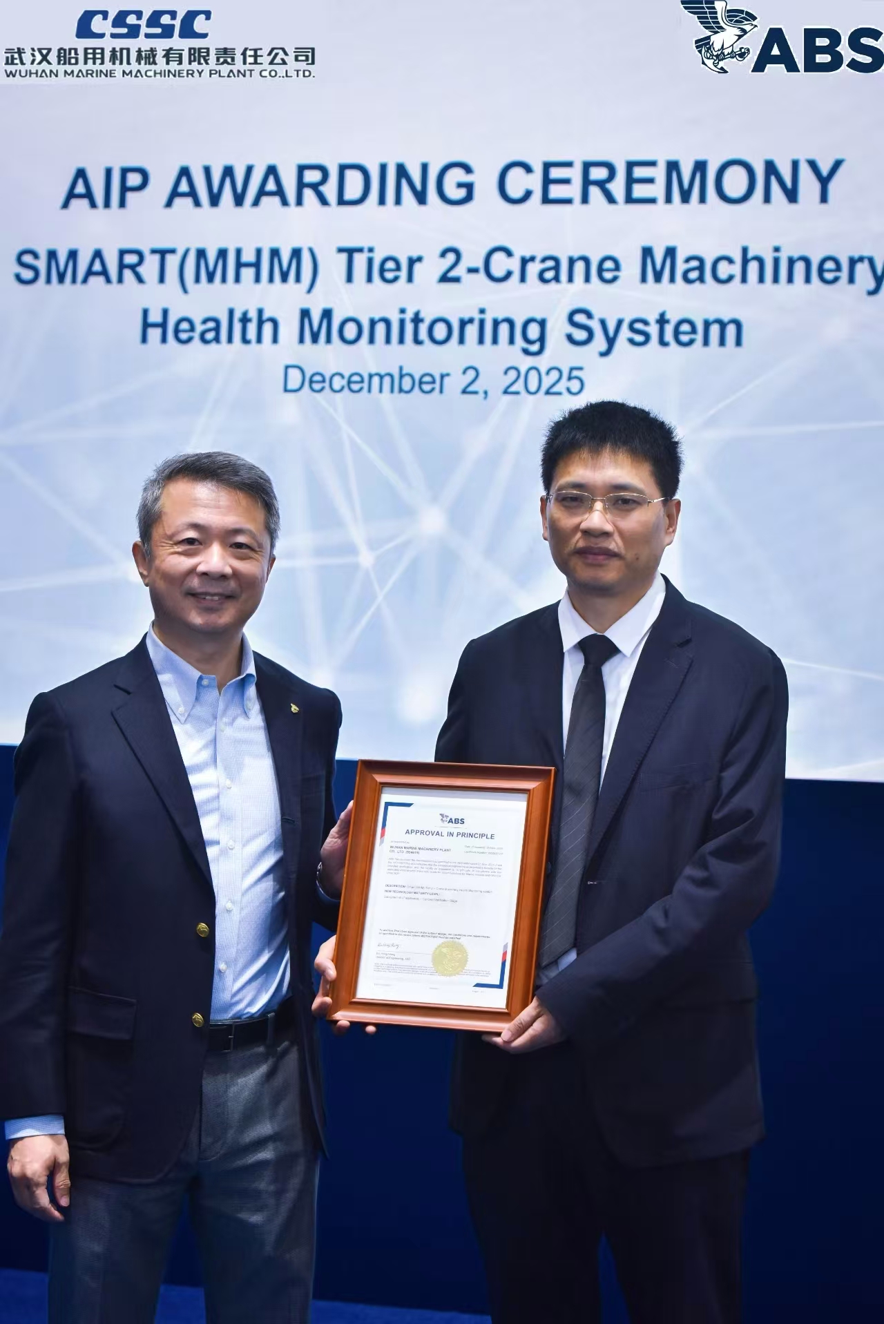 12月2日,2025年中國國際海事技術(shù)學(xué)術(shù)會(huì)議和展覽會(huì)開幕首日,中船武漢船機(jī)開發(fā)的海工吊機(jī)智能化健康監(jiān)測系統(tǒng)(SMART系統(tǒng))獲得ABS船級(jí)社SMART(MHM TIER 2)原則性批準(zhǔn)(AIP),這是國內(nèi)海工吊機(jī)首個(gè)成功取得該AIP認(rèn)證的系統(tǒng)。ABS船級(jí)社技術(shù)副總裁谷海、中船武漢船機(jī)副總經(jīng)理胡發(fā)國出席發(fā)證儀式。